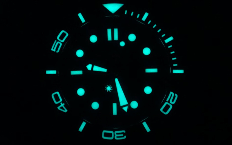 The OCT004 uses BGW9 Super-LumiNova, applied not only to the hands and indices but also to the ceramic bezel insert. Nighttime visibility is excellent, with a bright, lasting glow that meets professional dive standards.