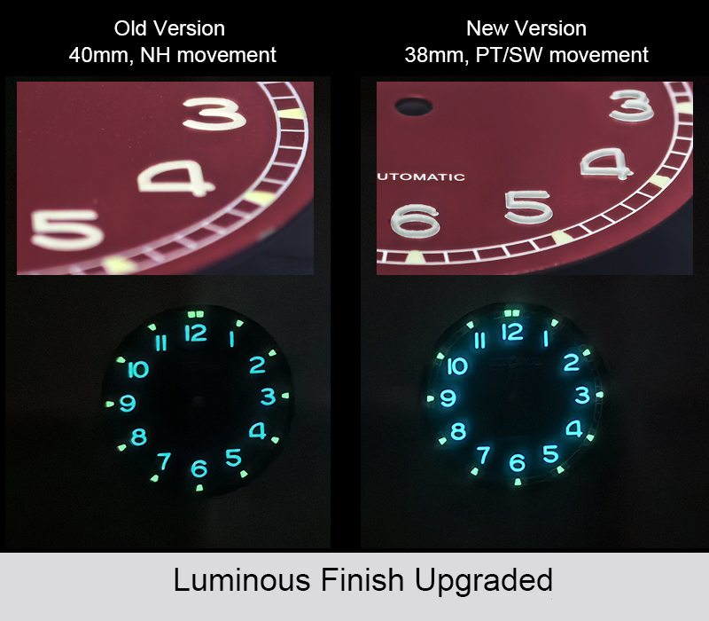 OCT022 is an upgraded version of OCT011.It features a refined 38mm case, bold 3D extra-thick lume, and the no-date PT5004 automatic movement (SW200 architecture). With domed sapphire crystal and a classic big crown, it delivers vintage pilot style with modern precision and clarity.